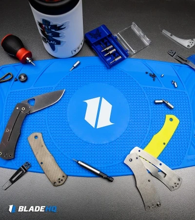 The Blade HQ Exclusive Blade HQ Shop Mat was designed to address the needs of knife enthusiasts and DIY-weekend warriors alike. This blue-colored silicone mat makes it so knives and other tools will remain stable while being worked on.