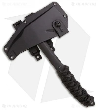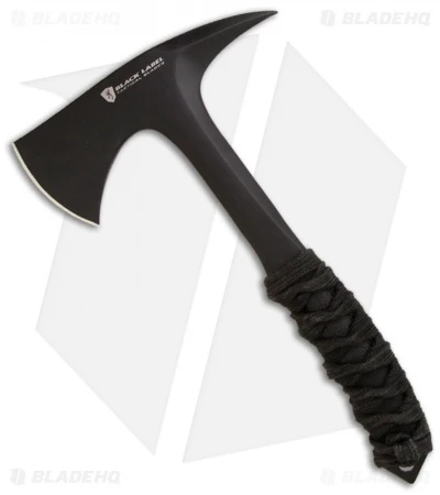 This intimidating combat tomahawk offers a black powder-coated sword-grade blade forged from 1055 stainless steel. The curved penetration spike puts a serious hole in hardened targets. The unique Black Label Tactical Blades logo adorns the side of the blade. Its one-piece handle with spiked pommel is hand-wrapped with black nylon paracord and has a generously-sized lanyard hole. The Blade-Tech™ molded polymer sheath with Tek-Lok™ belt clip easily adjusts for carry angle and belt loop width.