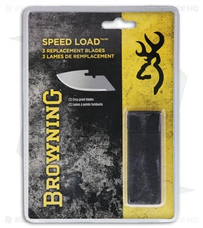 For the Speed Load Hunting Knife you will need the Browning Replacement Blade a pack of 3 replacement blades. You will never have a dull blade with these disposable blades that can be changed out in seconds, giving you a fresh sharp blade just when you need it. This pack of 3 blades are 420J2 stainless steel, drop point blades with a satin finish. They are ideal for skinning, dressing, caping and field boning big game, when stopping to sharpen you knife is not desirable.