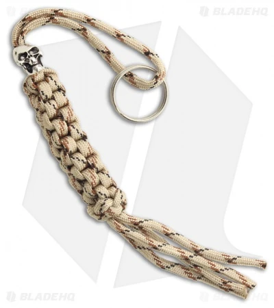 This desert tan camo paracord lanyard has a skull bead and removable split ring. 9 inch overall length.