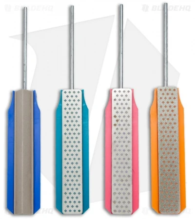 Gatco’s four stone diamond sharpening system is an easy way to put a great edge on any blade. Diamond stones make easy work of those hi-tech steels found on today’s fine knives. Contains three diamond stones (coarse, medium, and fine). Also contains a serrated edge honing stone for those hard to sharpen serrated blades. Knife clamp, angle guide, honing oil, and custom case included.