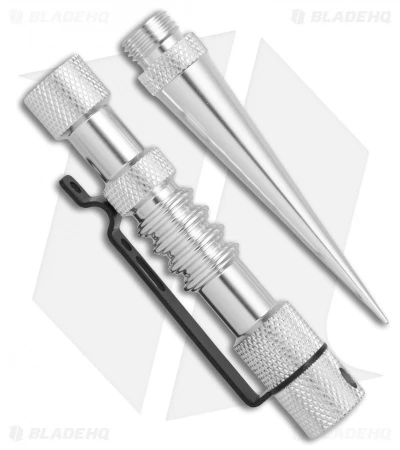 The Knotters Tool is made for the paracord and knot tying aficionado. It’s a simple instrument machined from a billet of aircraft aluminum in a satin finish. Patches of knurling keep it grippy and a stainless steel steel clip allows you to keep it handy. The body has a hollow core that’s roughly 3.5″ long and 0.32″ in diameter.