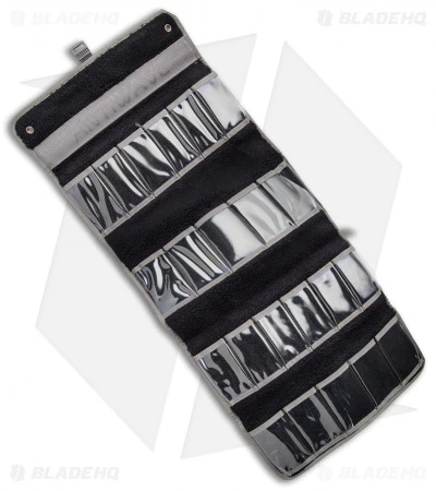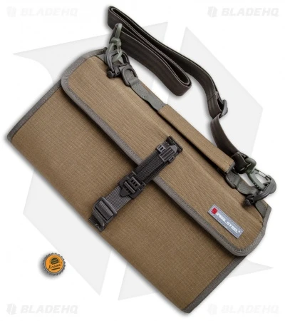 Protect your knives with the Real Steel Pilgrim 22 Knife Bag. It is made of coyote tan 1050 ballistic nylon with a berber fleece interior to protect from scratching and weathering. It features 22 TUP see-through pockets for holding each of your knives. It has a handle for easy carry and measures 7.7″ x 14.2″ x 2.5″. The front has an aluminum plate for added protection and a Duraplex quick release access and lock.