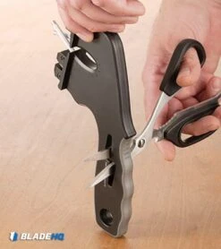 Smith’s new 4-in-1 Knife and Scissors Sharpener features pre-set crossed carbide blades, sharpening steels, ceramic stones, and a scissors sharpener. Carbide blades provide quick edge setting capabilities, and the sharpening steels offer the perfect edge alignment. Specially shaped ceramic stones provide a razor sharp edge on serrated or standard blades.